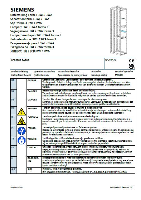 SIVACON S4 - 分隔形式3 用于安装3WL_3WA